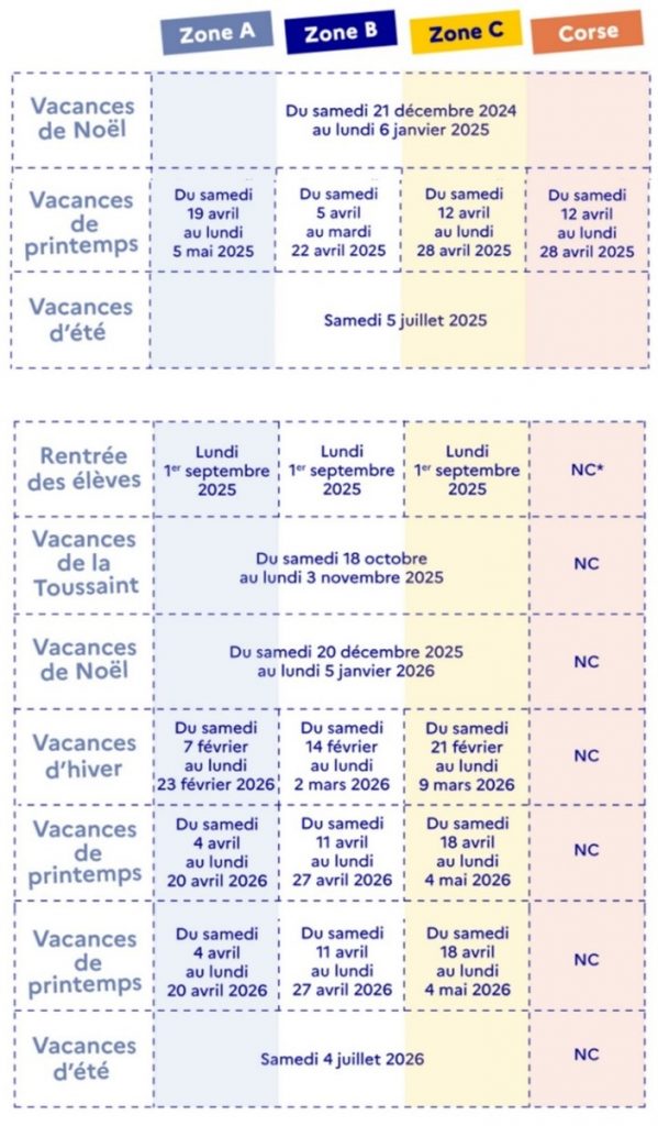 Regardez le calendrier du Ministère de l’Éducation Nationale (pour fin 2024, 2025 et 2026 !), pour ceux qui ont des enfants scolarisés. Pour les autres pas de panique, ce calendrier peut vous service à partir en dehors des vacances scolaires, afin de bénéficier de prix plus doux. Ou bien, vous aidez à planifier vos longs week-ends.